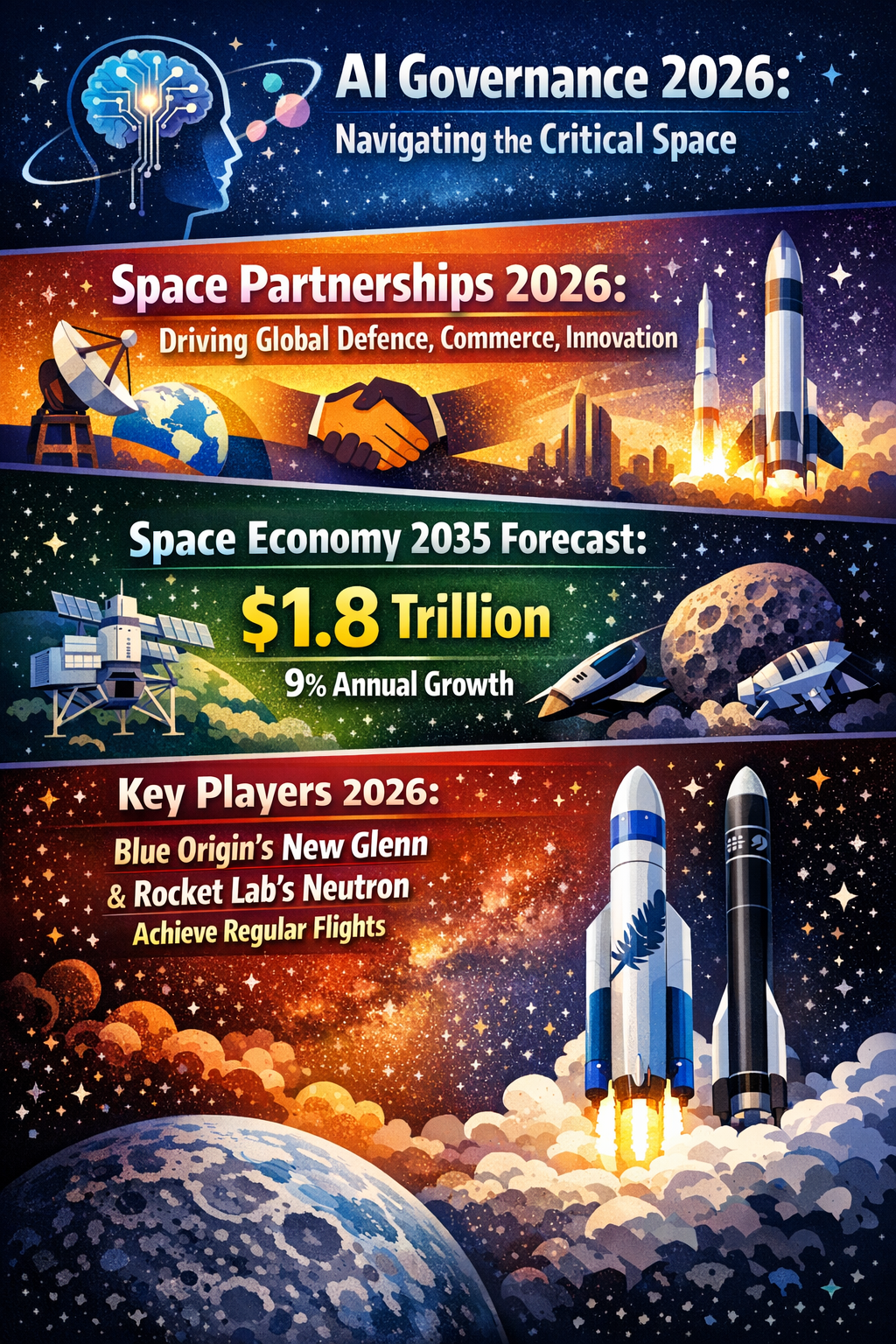 - Risks: Escalation of space arms races and weaponization; accidental collisions from crowded orbits; cyberattacks disrupting critical space infrastructure; regulatory gaps in AI governance affecting space systems.
