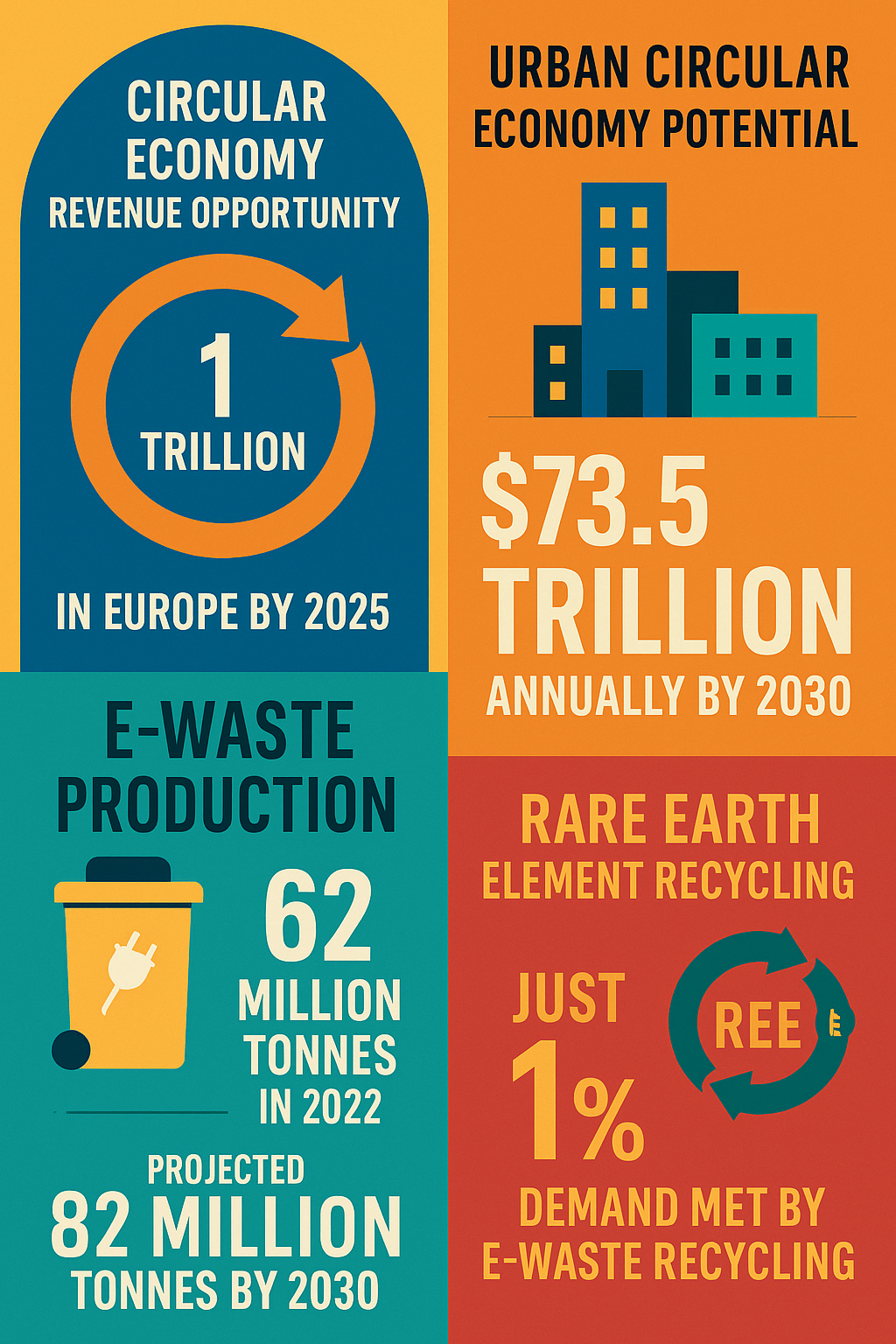 From an economic perspective, the potential is substantial. Projections show the circular economy could generate up to $1.944 trillion (€1.8 trillion) in benefits in the EU alone by 2030, accompanied by significant reductions in greenhouse emissions (Kings Research). Globally, the International Labour Organization estimates that millions of green jobs may emerge, particularly in recycling and resource recovery sectors, with India potentially generating 10 million jobs by 2050 (Polynext Conference).
