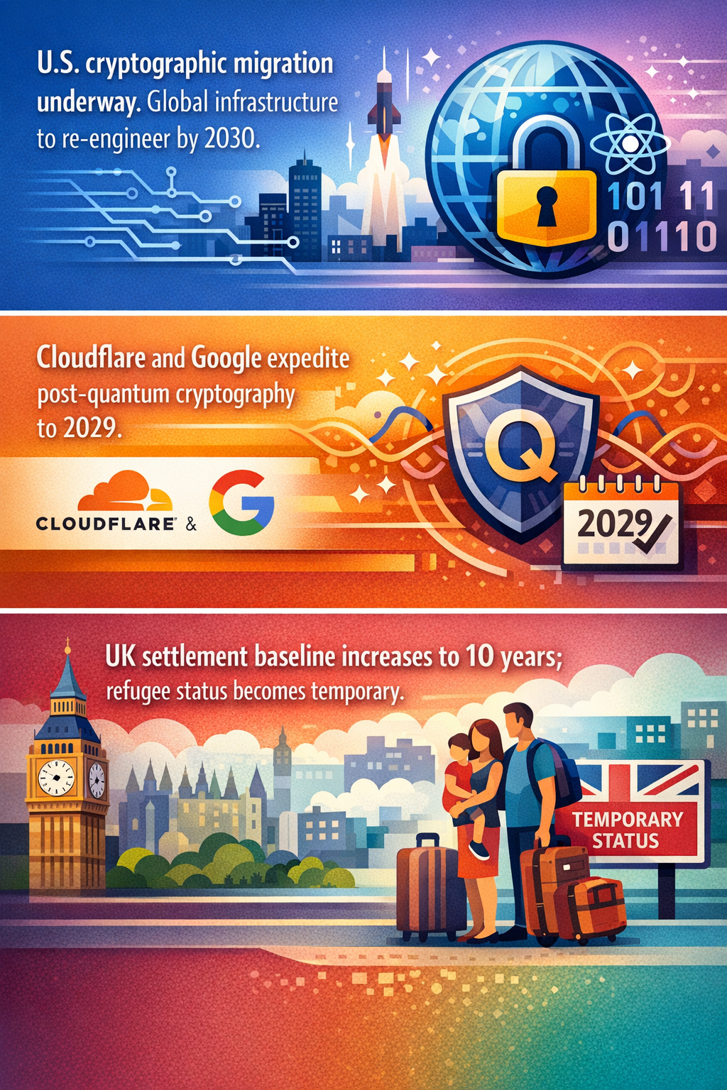 Collectively, these threads reveal a substantive structural theme: the convergence of emerging quantum-safe cryptographic infrastructures, AI-enabled immigration processing, and increasingly complex regulatory environments is setting the stage for a discrete but profound infrastructural pivot in migration and mobility management.