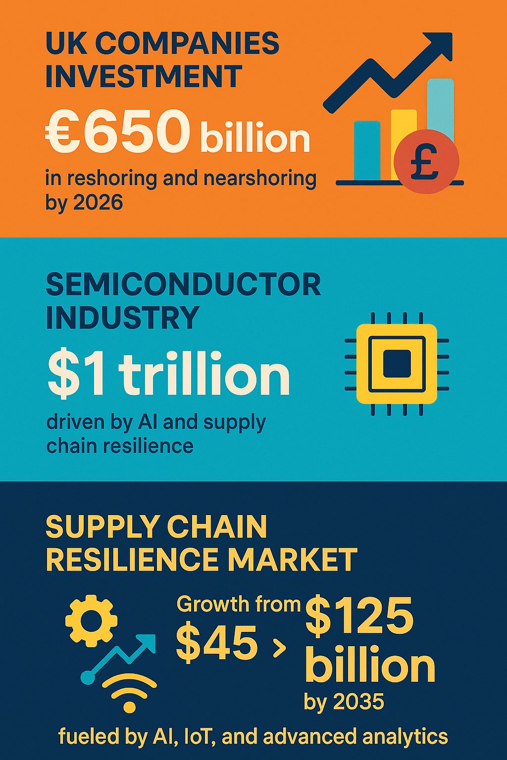 Even beyond North America, the United Kingdom is projected to invest $650 billion in reshoring and nearshoring activities within the next three years, underscoring that this trend is not confined to a single region or industry but is global in scope (UK’s Reshoring Investments).