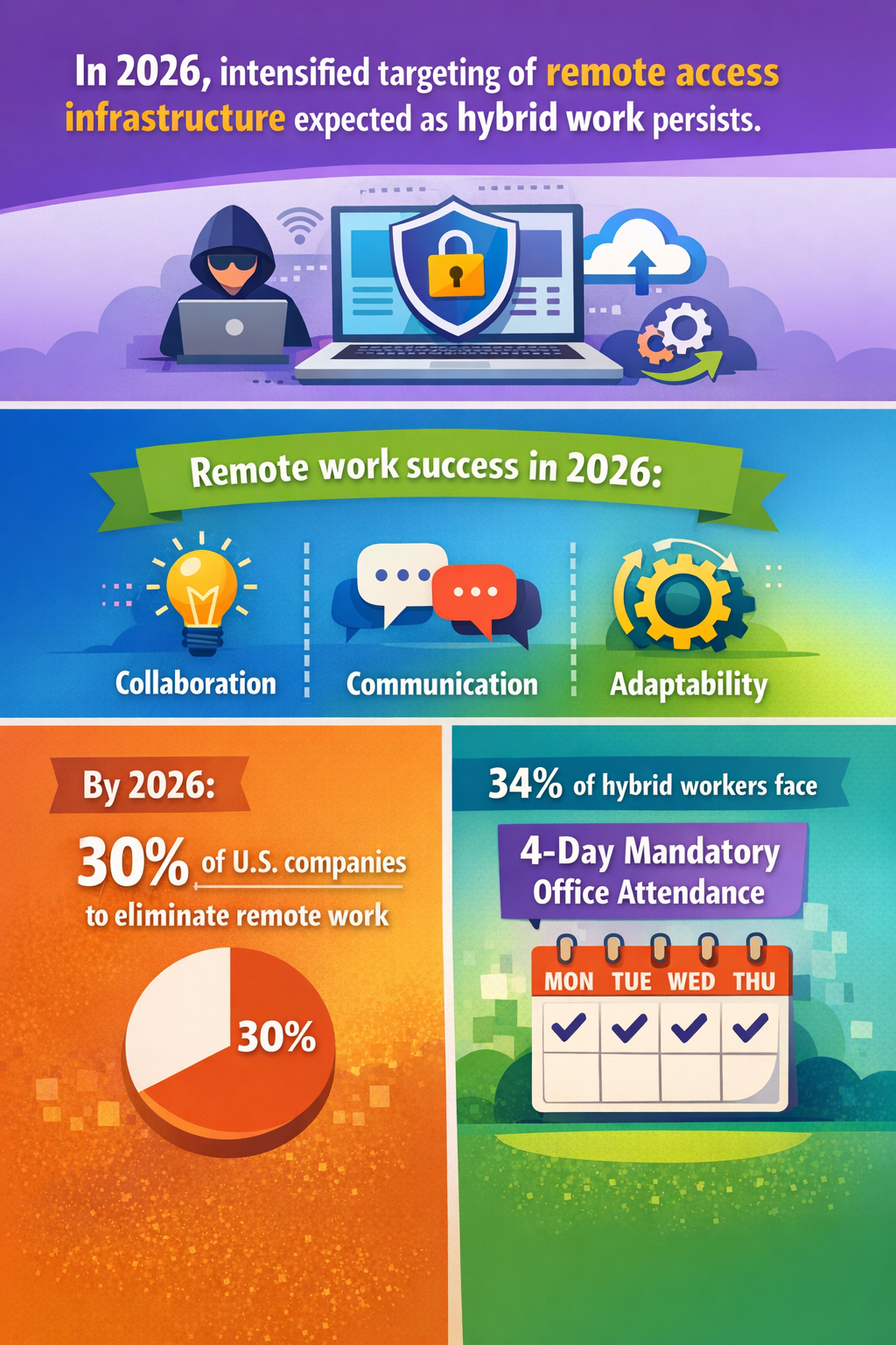 Technological and security landscapes are also shifting significantly. Remote access infrastructure is increasingly targeted by sophisticated cyberattacks, including those by state-sponsored actors. As long as hybrid and remote work arrangements persist, enterprises should expect greater security risks, especially from vendor remote support channels and operational technologies (Nexus Connect, 2026 source).
