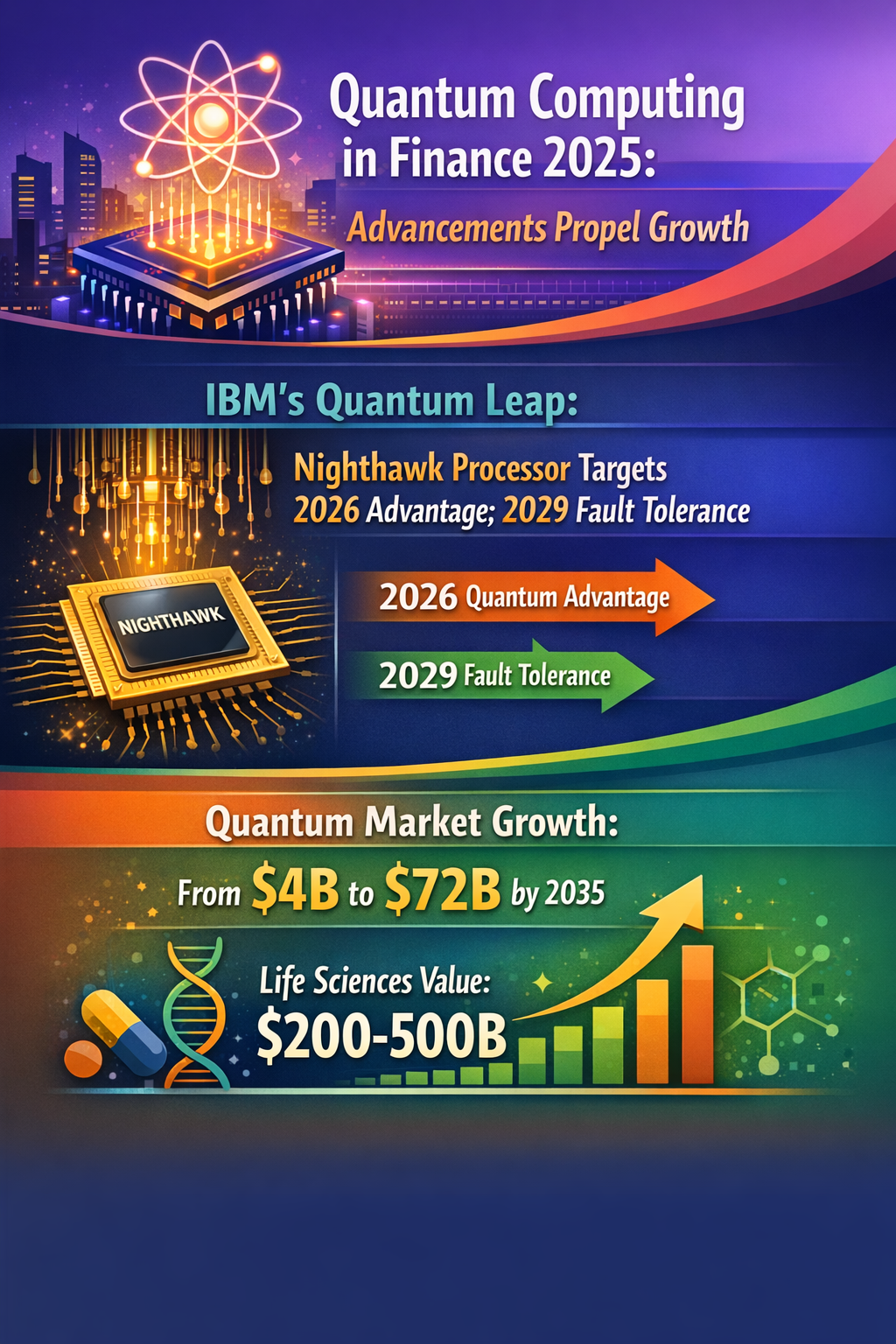 Recent research and industry announcements confirm that quantum computing is edging closer to disruptive application phases. IBM's unveiling of the Quantum Nighthawk processor (IBM Quantum Nighthawk), which pushes toward quantum advantage by 2026 and fault-tolerant quantum computing by 2029, exemplifies this trend. The roadmap indicates scaling from current 433-qubit systems toward 1,000+ qubits within a year, advancing computational capacity in a timeline that surpasses many earlier projections (IBM Quantum Nighthawk).
