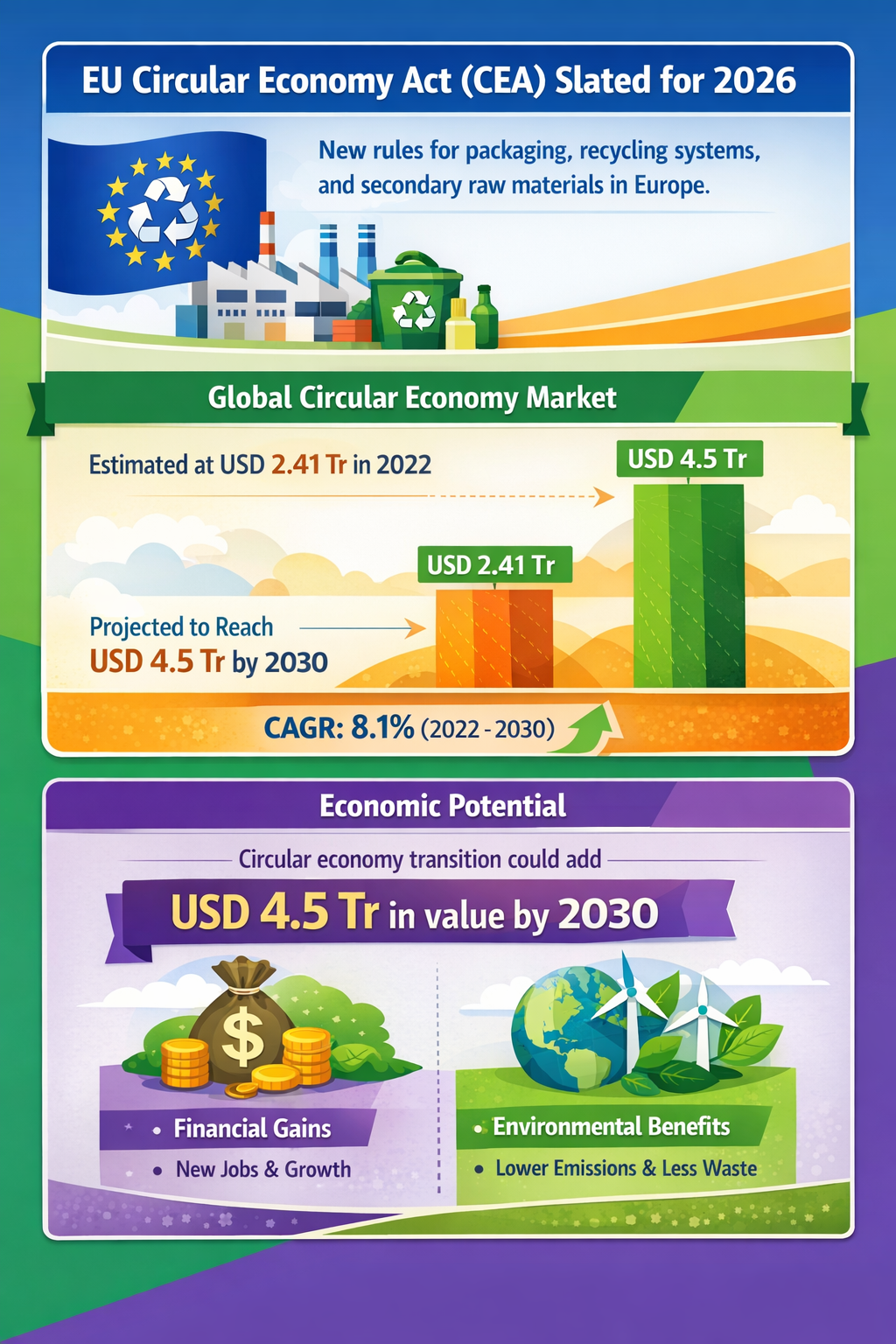 - The Circular Economy is gaining regulatory momentum, notably through the upcoming EU Circular Economy Act (CEA) in 2026, targeting packaging, recycling, and secondary raw material use (Yahoo Finance).