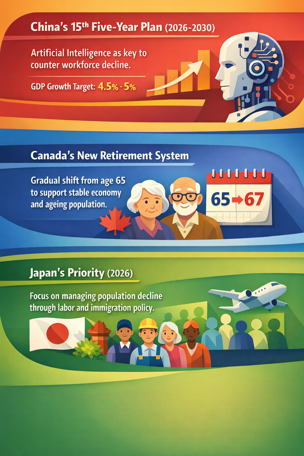 • The draft for the 15th Five-Year Plan (2026-2030) positions artificial intelligence as the primary mechanism to offset a shrinking workforce and a slowing GDP, which has been targeted at 4.5% to 5% for the current year. / China. DevFlokers. Published 11/03/2026.