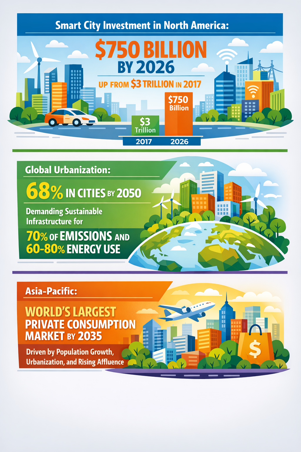 This move is linked to the broader smart city initiatives observed worldwide, such as the ambitious NEOM project in Saudi Arabia and Dubai’s Smart City plans. These efforts aim to integrate technology, sustainability, and urban living to create efficient and futuristic environments (Almithaq Institute). Investment in smart city infrastructure is soaring, with North American smart city projects forecasted to reach $750 billion by 2026 (CCEOnlineNews).