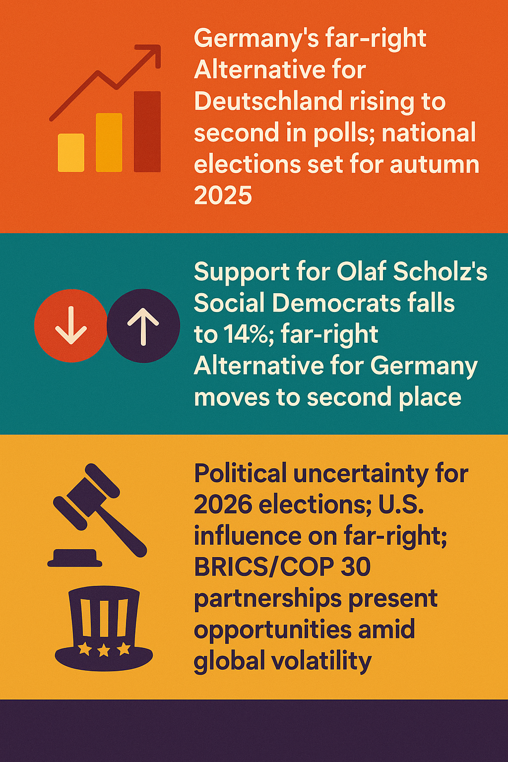 - Businesses: Should incorporate political risk analysis into forecasting and scenario planning. Supply chains, trade routes, and investment climates might experience volatility related to nationalist or protectionist policies. Public affairs teams will also need increased vigilance on regulatory and reputational risks linked to rising far-right narratives.