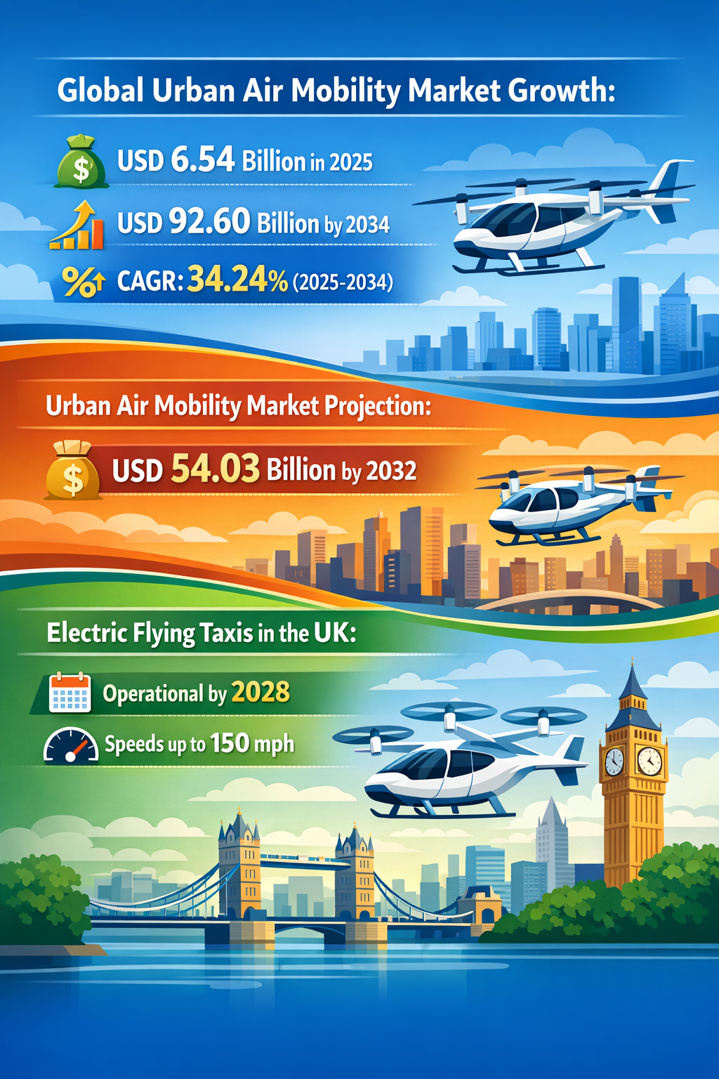 | Global Competition and Regional Initiatives | Accelerating | Medium — Demonstrated by parallel initiatives in UK, US, China, EU | Strategic developments in regions such as the UK, US, China, Europe, and the Middle East reflect a global race to capture market leadership in urban air mobility, with government policies and pilot projects indicating concerted efforts to operationalize commercial flying taxis. |