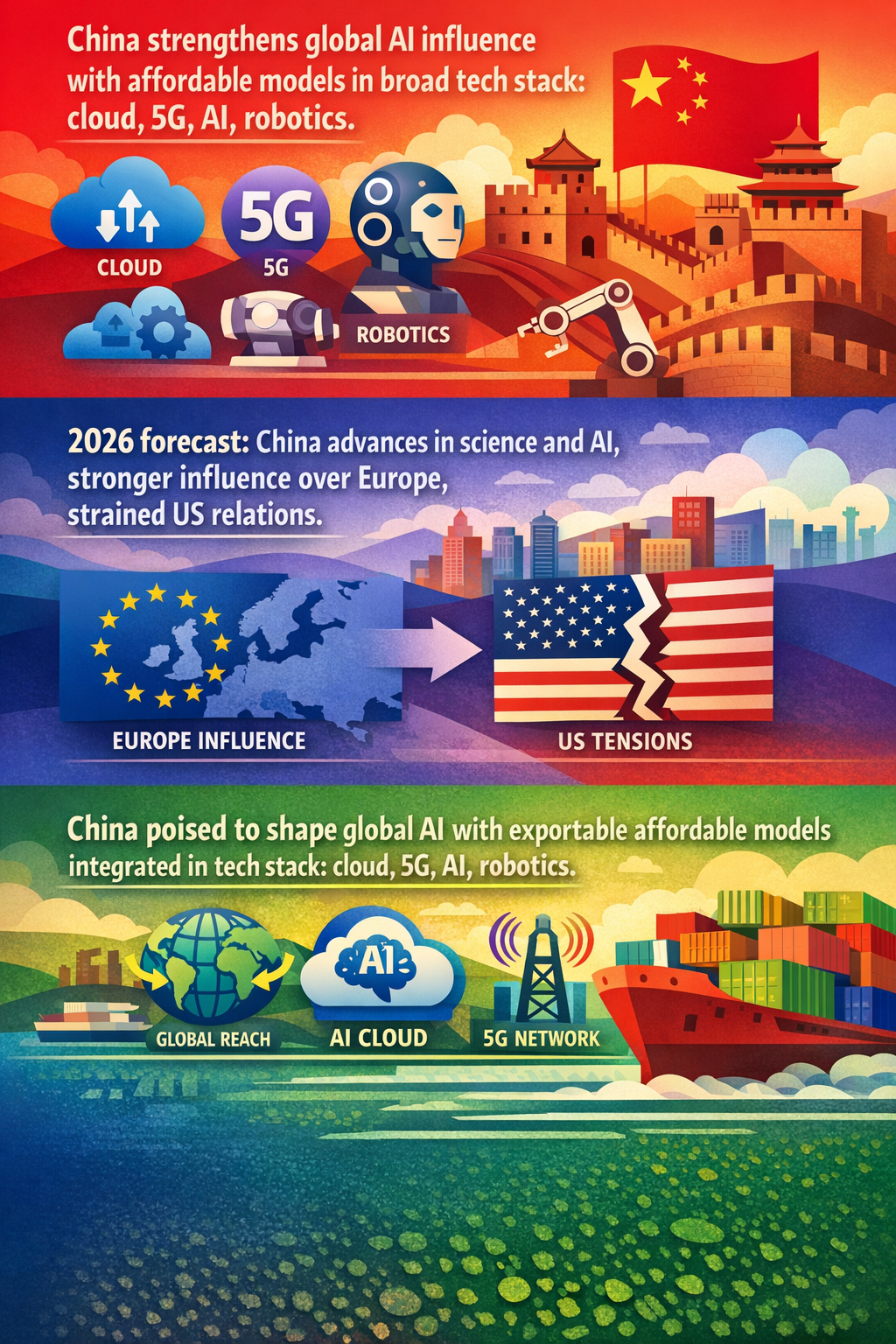 | China’s Affordable Vertically Integrated AI Offering | Emerging ability of China to export affordable AI models embedded in a wider vertical stack — spanning cloud, 5G networks, and embodied AI/robotics — beyond frontier AI model leadership dominated by US firms. | Fragmented and nascent; emerging mainly in select R&D vertical pilots with limited global visibility. | Emerging | Challenges the assumption that US dominance in frontier AI models guarantees global AI hegemony; could enable China to shape AI in cost-sensitive sectors worldwide by leveraging ecosystem integration. |