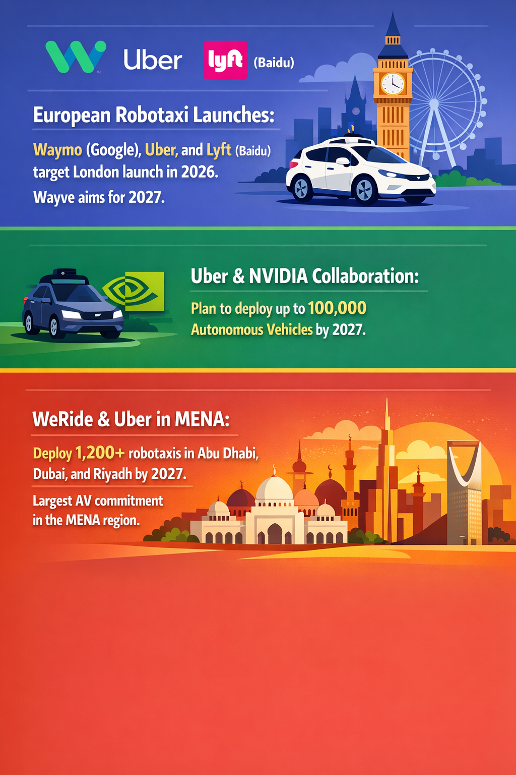 - Deployment of 1,200 robotaxis in Middle East markets (Abu Dhabi, Dubai, Riyadh) highlights Uber’s push into emerging autonomous mobility markets.